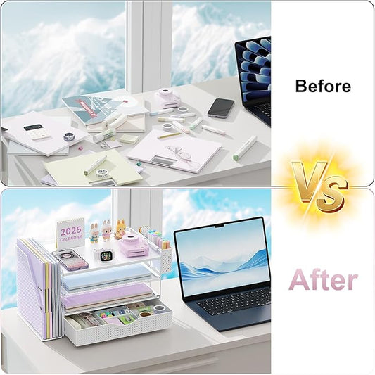 gianotter Desk Organizers and Accessories with File Holder, 4-Tier Desk Accessories & Workspace Organizers with Drawer and 2 Pen Holder, Paper Organizer for Office Supplies (White)