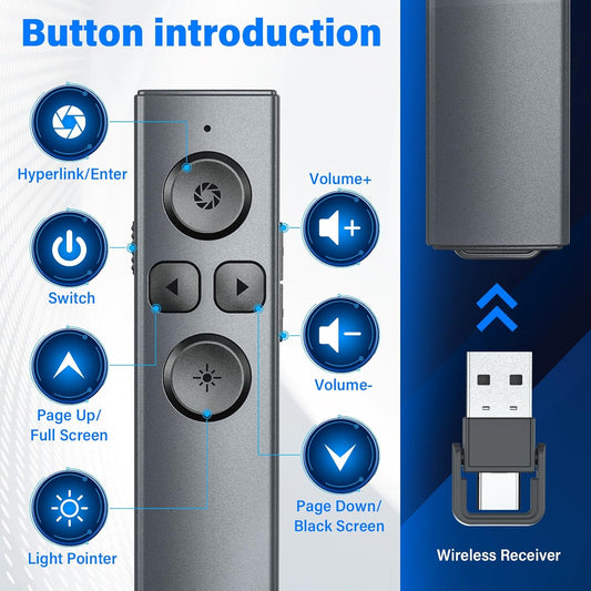 2-in-1 USB Type C Presentation Clicker, Rechargeable Wireless Presenter Remote, Clicker for PowerPoint Presentations, Pointer for Presentations Slide Advancer with Volume Control for Mac,Computer, PPT