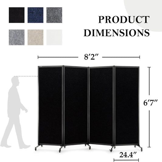 Upgrade Version Room Partition and Divider, Freestanding Rolling Dividers with Wheels,Office Privacy Screen Divider Wall,Classroom Felt Dividers,8'2"L* 6'7"H,4 Panel,Black