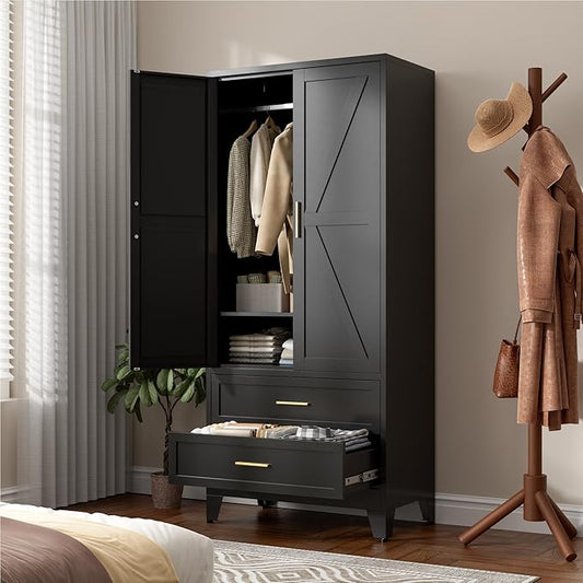 Metal Armoire Wardrobe Closet with Two Drawers, 71" Tall Large Wardrobe Cabinet with Hanging Rod, Clothing Storage Cabinet with Doors and Shelves for Bedroom, Black, Assemble Required