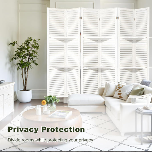 NicBex 6 Panel Room Divider,5.6FT Wood Carved Room Dividers with Display Shelves Folding Privacy Screens Portable Freestanding Partition Wall Dividers for Room Separation,Home Bedroom Office,White