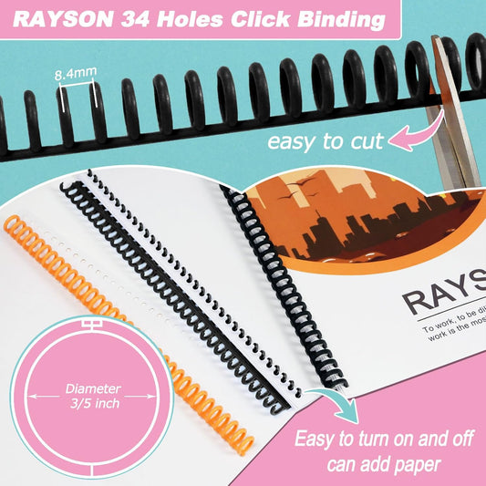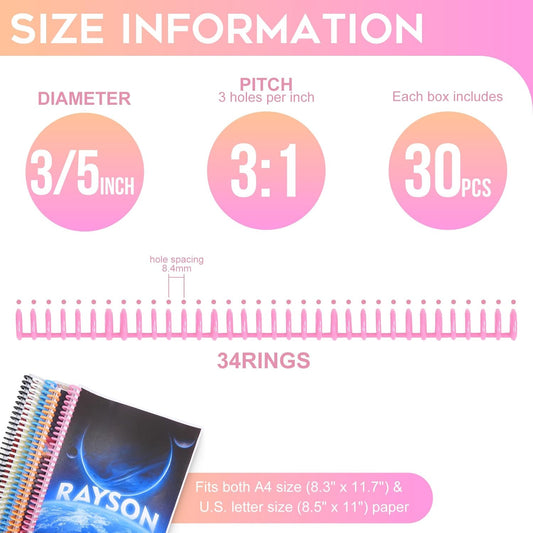 Rayson Click Binding Spines, 34-Hole Click Binding Ring for A4 and U.S. Letter Size Paper, Multi-Color, 3/5" Diameter, 3:1 Pitch, Binds Up to 120 Sheets, 30 Pack