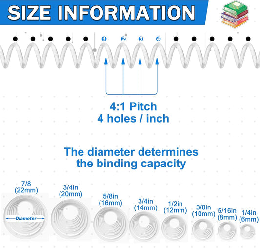 120 Pack Plastic Spiral Binding Coils Binder Binding Spirals Rings 8 Size Spiral Binding Wire Combs Spines Coils, 4:1 Pitch, 1/4 5/16 3/8 1/2 9/16 5/8 3/4 7/8 Inch (Transparent)