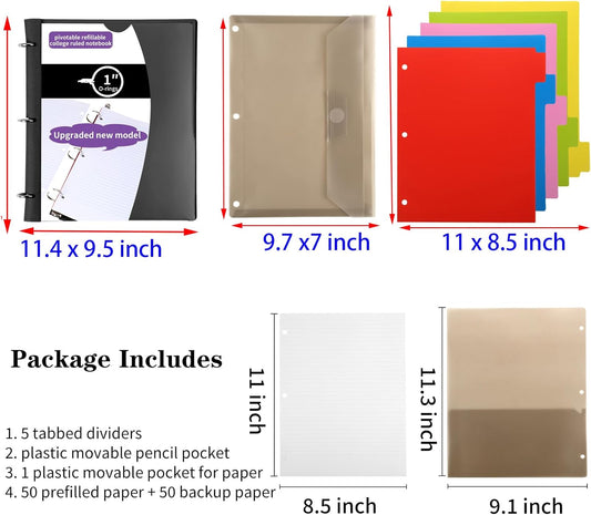 Pivotable Refillable Notebook, Upgraded 1 Inch 3 Ring Notebook Binder, 100 College Ruled Paper, 5 Subject Notebook with Dividers and Folder Pockets, Tabs- Black