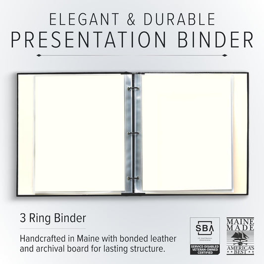 Gallery Leather 3 Ring Binder with Plastic Sleeves, Includes 10 Sheets, Sheet Size: 8.5" x 11" - Presentation Binder Rings with Window and Hubbed Spine, Thick: 1.25" Belfast Black