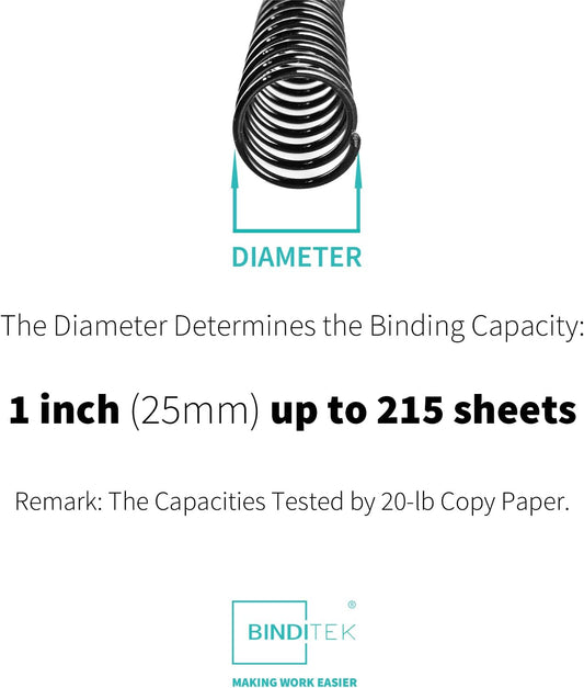 Binditek 50 Pack Plastic Spiral Binding Coils, 25mm(1"), 215 Sheet Capacity, 4:1 Pitch, Black, 48 Loops, for Letter Size, for Students and Coworkers