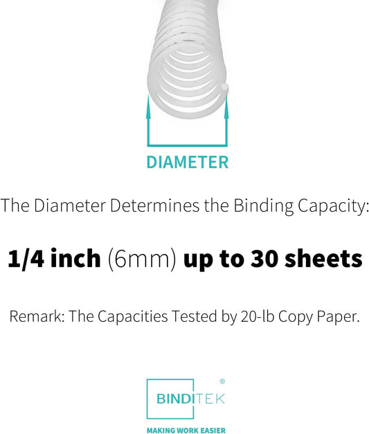 Binditek 50 Pack Plastic Spiral Binding Coils, 6mm(1/4"), 30 Sheet Capacity, 4:1 Pitch, White, 48Loops, for Letter Size, for Students and Coworkers