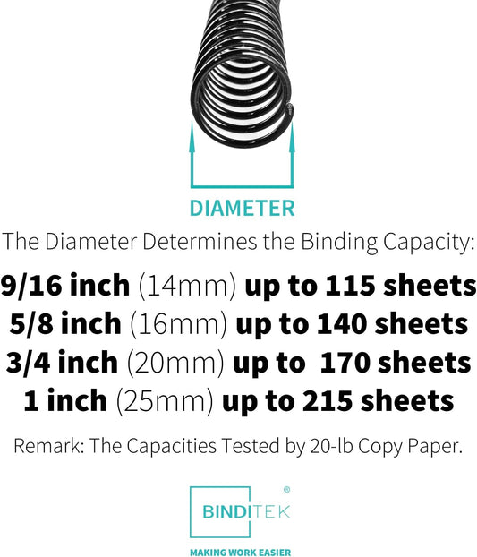 Binditek 100 Pack Plastic Spiral Binding Coils, 14mm(9/16"), 115 Sheet Capacity, 4:1 Pitch, Black, 48 Loops, for Students and Coworkers
