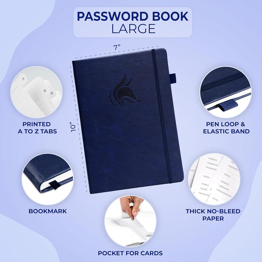 Clever Fox Password Book with alphabetical tabs. Internet Address Organizer Logbook. Large Password Keeper for Website Logins (Dark Blue)