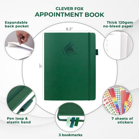 Clever Fox Appointment Book – Hourly Schedule Planner with 15-Minute Increments – Time Box Planner for Daily Work & To-Dos – Weekly & Monthly Spreads, Undated, Hardcover, 8.3x11″ (Dark Green)