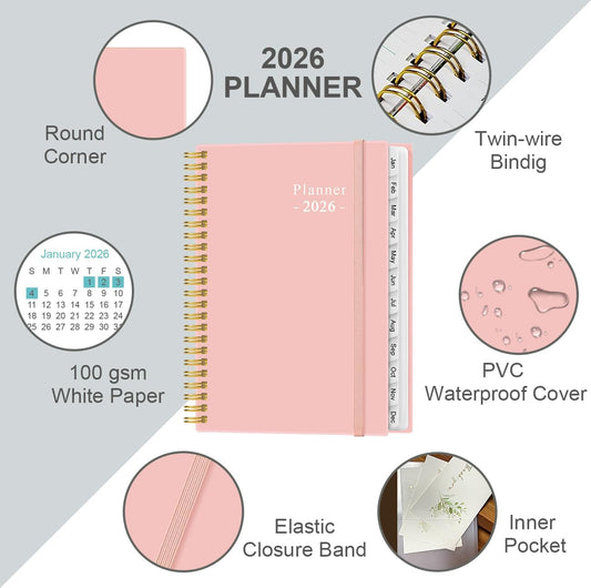 2026 Planner - Planner 2026 from January 2026 - December 2026, Weekly & Monthly Planner Spiral Bound with 12 Monthly Tabs, Inner Pocket, 6.4" x 8.5", Pink-E