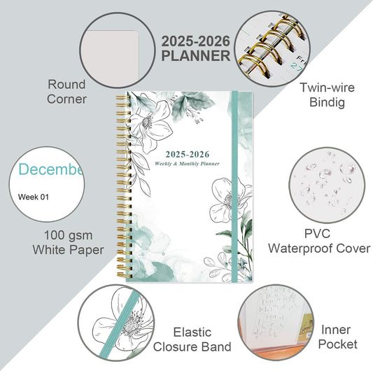 Planner 2025-2026 - July 2025 - June 2026, Academic Planner 2025-2026 with Flexible Cover, Tabs, Inner Pocket, Spiral Bound, 6.4" x 8.5", Teal Flowers