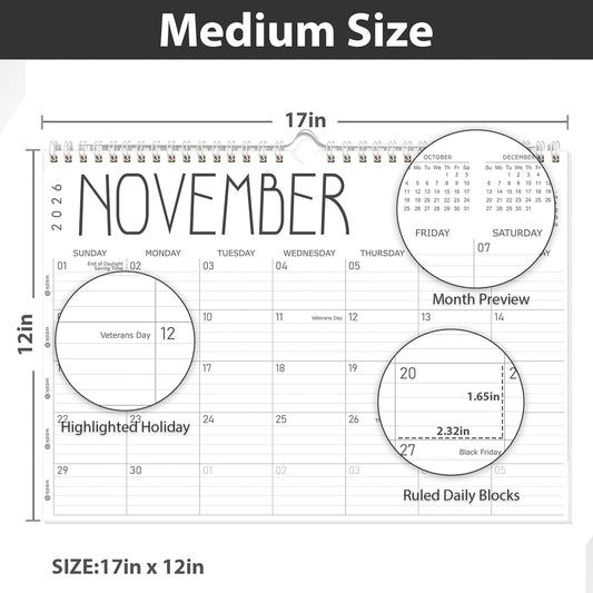 GuassLee Wall Calendar 2026 12 Months Planner Through Jan. 2026 to Dec 2026 17" X 12" Paper Monthly Planner Wall Hanging Calendar with Thick Paper for Easy Organizing