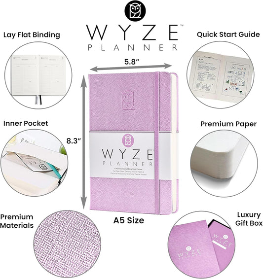 Undated Daily Planner – 6-Month A5 Productivity Organizer with Full Page Per Day, Hourly Schedule, Goal Setting, Habit Tracker, Weekly & Monthly Pages – Hardcover Time Management Notebook (Lilac)