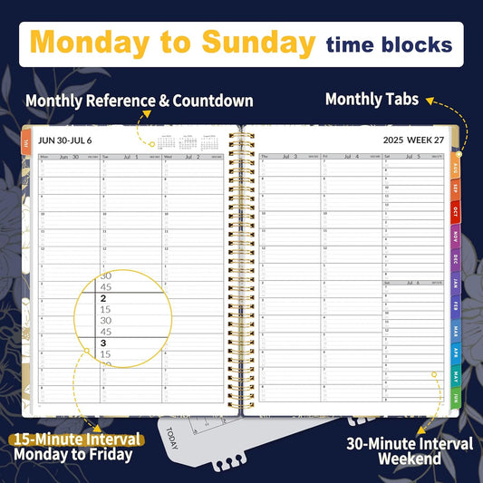 SUNEE 2025-2026 Appointment Book, Quarter-Hourly, Weekly & Monthly - from July 2025 to June 2026, 8.5"x11" Academic Planner, Flexible Cover, Note Pages, Bookmark, Spiral Binding, Leaves