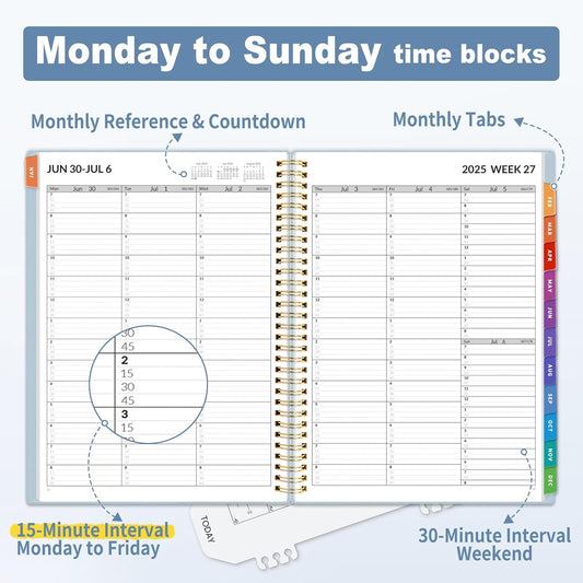 SUNEE 2025-2026 Appointment Book, Quarter-Hourly, Weekly & Monthly - from July 2025 to June 2026, 8.5"x11" Academic Planner, Flexible Cover, Note Pages, Pockets, Bookmark, Spiral Binding, Blue