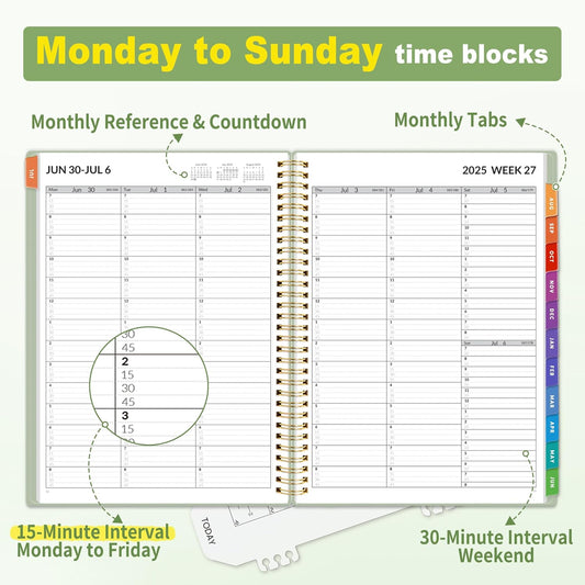 SUNEE 2025-2026 Appointment Book, Quarter-Hourly, Weekly & Monthly - from July 2025 to June 2026, 8.5"x11" Academic Planner, Flexible Cover, Note Pages, Pockets, Bookmark, Spiral Binding, Sage Green