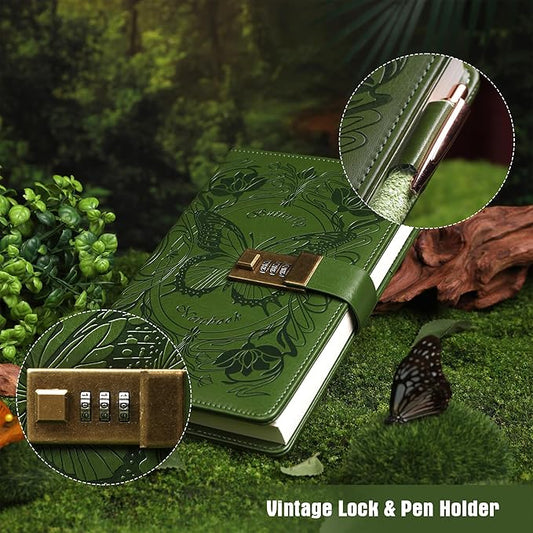 TIEFOSSI Diary with Lock for Women Girls, Lined Locked Journal, Butterfly Journal Notebook with Pen and Bookmark, A5 Refillable Locking Journals for Writing, 224 Numbered Pages