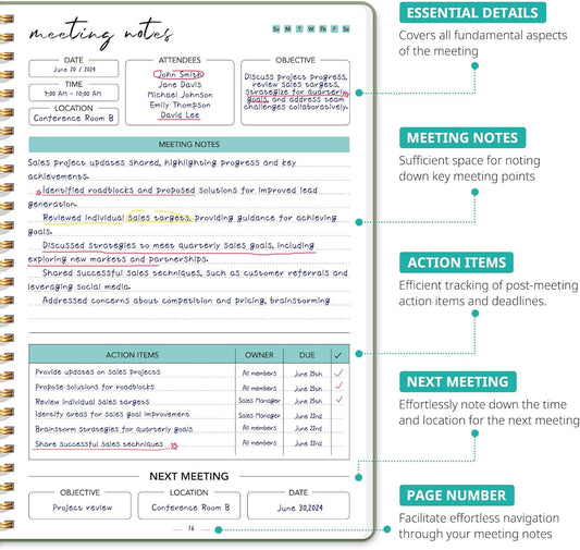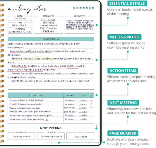 Taja Meeting Notebook for Work Organization - Work notebook with action items, Meeting Minutes Planner Notebook, Perfect Office Supplies for Men & Women - Green