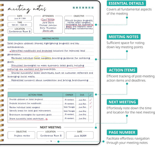 Taja Meeting Notebook for Work Organization - Work notebook with action items, Meeting Minutes Planner Notebook, Perfect Office Supplies for Men & Women - Black