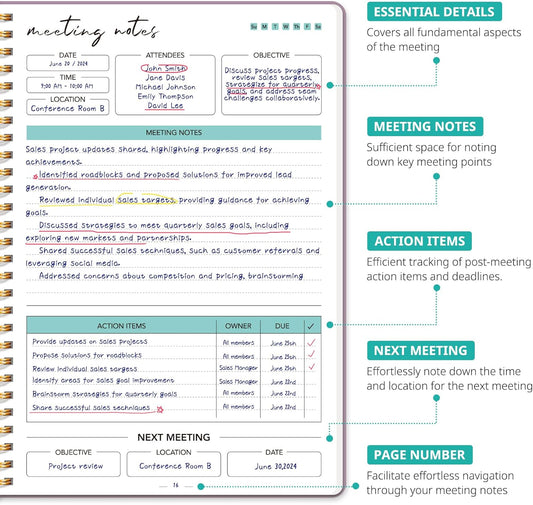 Taja Meeting Notebook for Work Organization - Work notebook with action items, Meeting Minutes Planner Notebook, Perfect Office Supplies for Men & Women - Pink