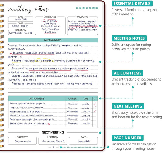 Taja Meeting Notebook for Work Organization - Work notebook with action items, Meeting Minutes Planner Notebook, Perfect Office Supplies for Men & Women - Burgundy