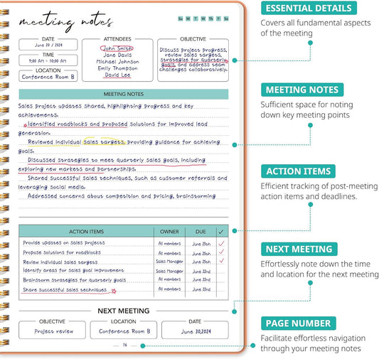 Taja Meeting Notebook for Work Organization - Work notebook with action items, Meeting Minutes Planner Notebook, Perfect Office Supplies for Men & Women - Coral