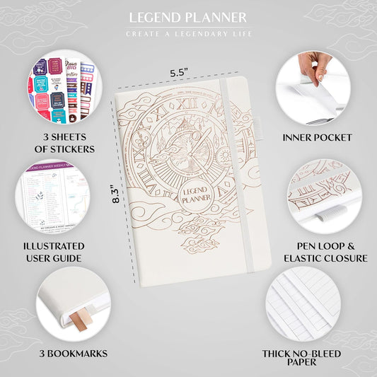 Legend Planner – Weekly & Monthly Life Planner to Hit Your Goals & Live Happier. Organizer Notebook & Productivity Journal. A5 (White)