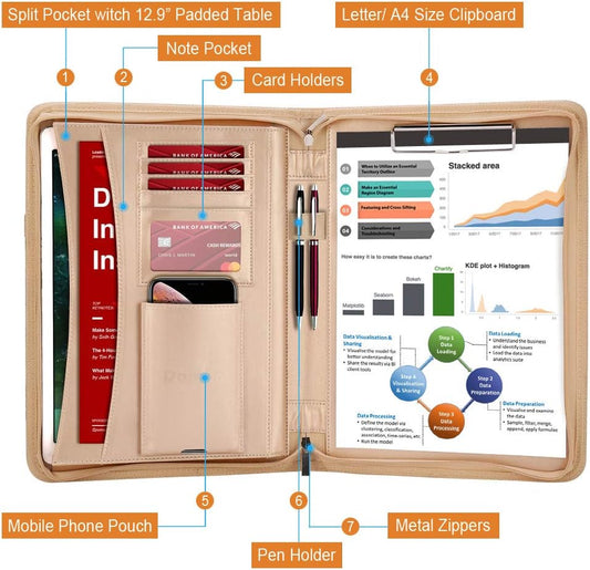 Darolin Zippered Leather Padfolio Portfolio with Hidden Handle and Clipboard, Business Conference Organizer Notepad Folder, Portfolio Bag, Padfolio for Women/Men (Gold)