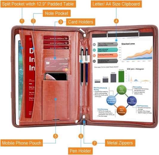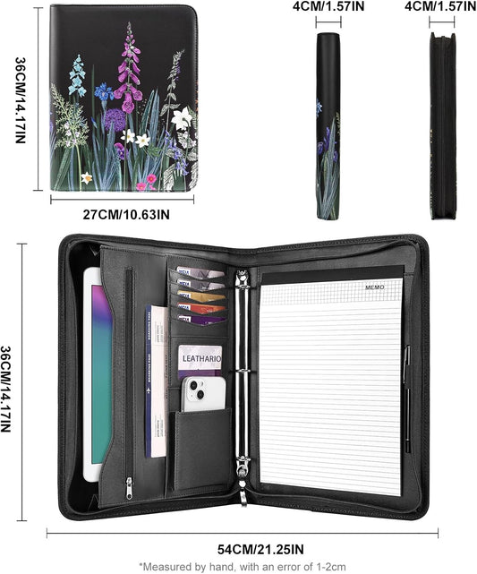 Leathario Portfolio Binder, Includes 5 Folder Index Dividers and 3 Notepads, 3-Ring Folder Organizer, Padfolio with Zipper, Vegan Leather Tablet Sleeve, Business Office Conference Clipboards