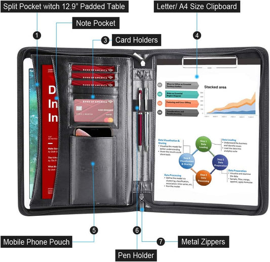 Darolin Zippered Leather Padfolio Portfolio with Hidden Handle and Clipboard, Business Conference Organizer Notepad Folder, Portfolio Bag, Padfolio for Women/Men (Black)