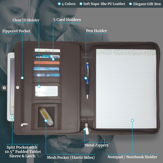 Dark Brown Zippered Portfolio Binder - PU Leather Business Portfolio Organizer - Padfolio for Men & Women with US Letter Notepad, 10.5 Inch Tablet Pocket & Gift Box by Lautus Designs