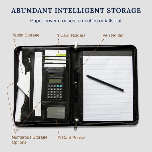 Cossini Black Superior Vegan Leather Business Portfolio with Zipper – Padfolio All-in-One. Smartest Protective 10.1 Inch Tablet Sleeve, Presentation Slot, Solar Calculator, Card Storage, Writing Pad