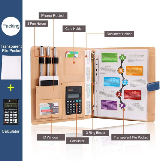 A4 Leather Padfolio with 3 Ring Portfolio Binder with Clipboard Padfolio for Women Men Professional Office Three Binders Organizer with Calculator Planner Portfolio Executive Closure Notebook Folder
