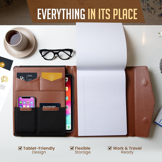 Brown Leather Portfolio Organizer Clipboard Storage Folio Padfolio for Men Notepad Notebooks for Work