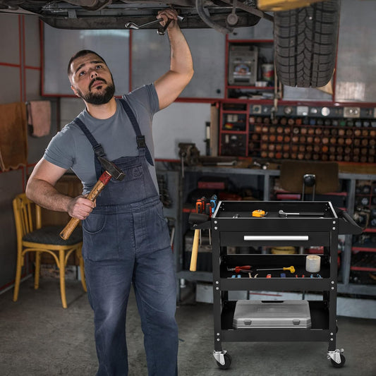ERGOMASTER Metal Service Utility Cart with Wheels - 500LBS Tool Cart Heavy Duty Rolling 3-Tier Storage Organizer, for Garage Industrial Cart -Black