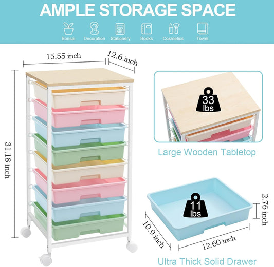 Rolling Storage Cart with Drawers,Utility Cart With 8 Drawers and Wooden Tabletop,Rolling Drawer Cart,Storage Drawer Cart for Living Room,Classroom,Bedroom,Bathroom,Dorm,Office,Rainbow