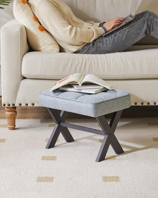 IBUYKE Small 12" H Footrest Stool, Square Linen Foot Stool with Metal X-Leg, Multi-Use as Small Side Table, Step Stool for Living Room, Bedroom, Entryway, Office, Blue Gray WBD011L