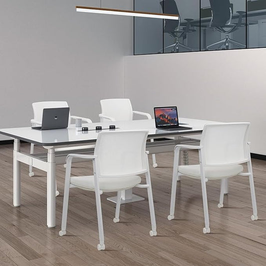 CLATINA Stacking Office Chairs with Wheels | Mesh Back, Thicken Leather Seat and Streamline Armrests, Ergonomic Lumber Support | School, Desk, Guest Reception, Waiting, Conference | Set of 4, White