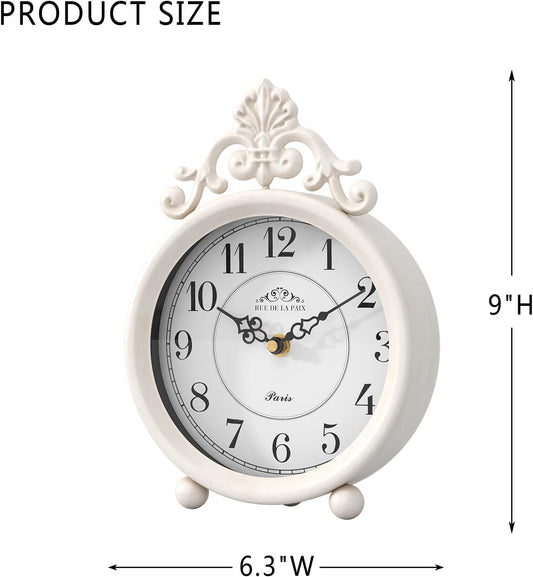 Vintage White Table Clock, Desk and Shelf Mantel Clock, French Rustic Antique Style Decor Clocks, for Farmhouse, Bedroom, Living Room, Bedside, Gift (9" H x 6.3" W)