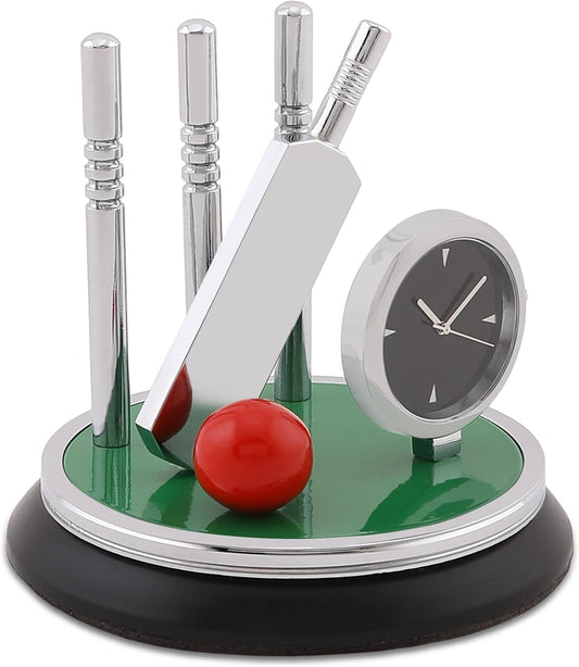 Metal Cricket Kit Style Table Clock, Silver Finish Clock with Bat, Ball & Stumps, Battery Operated Desk Showpiece, Paperweight for Office, Home Decor, Gift for Cricket Lovers