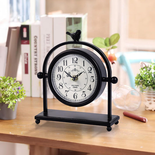 MODE HOME Silent Battery Operated Black Metal Analog Desk Clock with Bird, Small Table Clock for Farmhouse Decor, Mantel Shelf, Home and Living Room