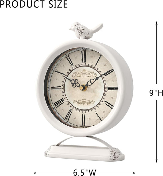 Vintage Table Clock with Bird, European Antique Style White Mantel Clocks, Desk and Shelf Decor Clock, for Farmhouse, Bedside, Living Room, Bedroom, Gift (9" H x 6.5" W)