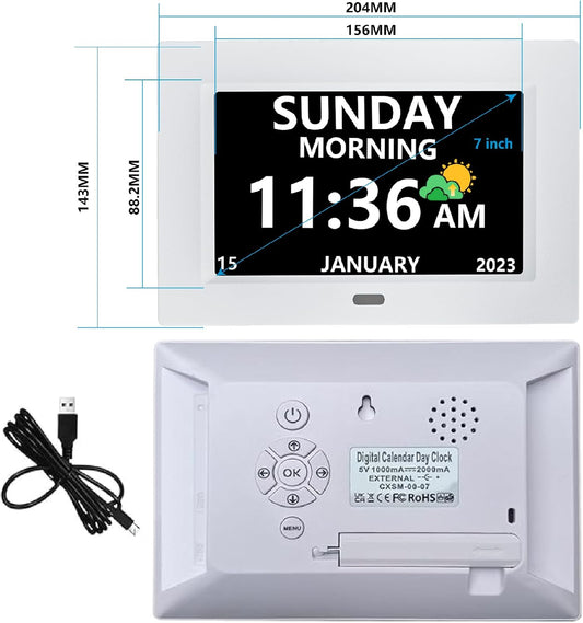 Alarm Clock with Day and Date for Elderly Digital Calendar Clock Photo Frame- Auto Dimmable Display 15 Alarm Options (7inch White)