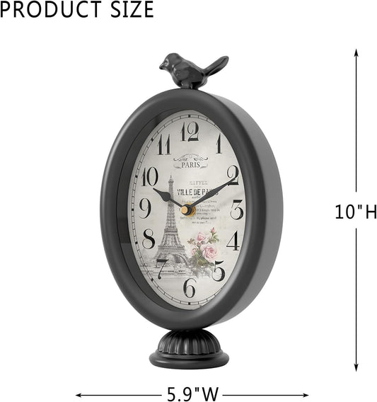 Vintage Table Clock with Bird, Desk and Shelf Decor Clock, French Paris Style, Antique Black Metal Mantel Clocks for Living Room, Farmhouse, Bedroom, Bedside, Gift (10" H x 5.9" W)