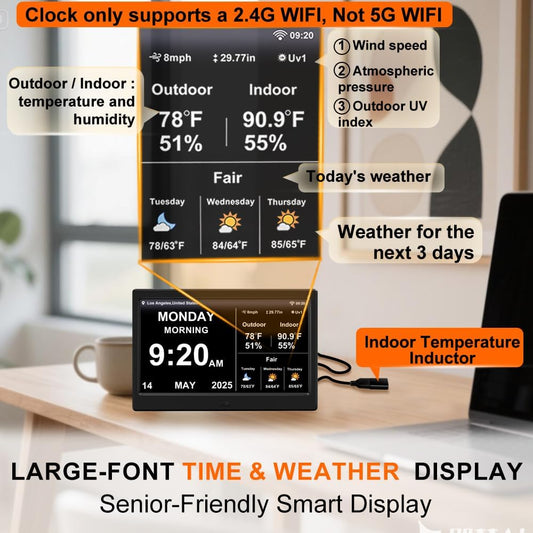 2025 Digital Clock with Weather Forecast & Temperature/Humidity Large Display,Auto Time Sync, Custom Alarms & Medication Reminders, Elderly Memory Loss