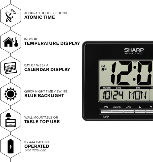 Sharp Atomic Desktop Clock – Auto Set Digital Alarm Clock - Atomic Accuracy - Easy to Read Screen with Time/Date/Temperature Display- Perfect for Nightstand or Desk