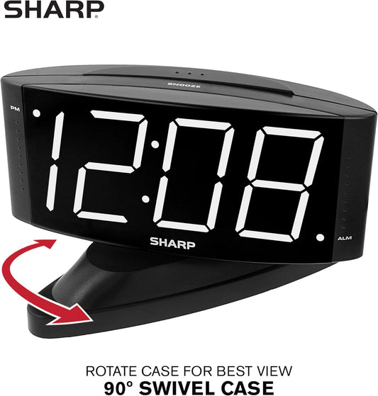 Sharp Home LED Digital Alarm Clock – Swivel Base - Outlet Powered, Simple Operation, Alarm, Snooze, Brightness Dimmer, Big White Digit Display, (Black-White LED)