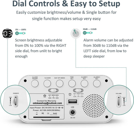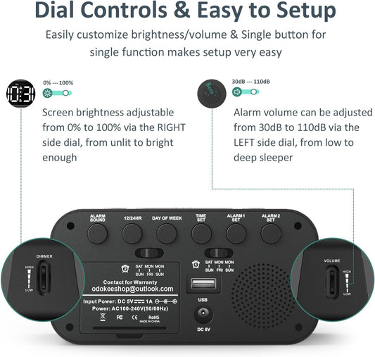 Digital Dual Alarm Clock for Bedroom, Easy to Set, 0-100% Dimmer, USB Charger, 5 Sounds Adjustable Volume, Weekday/Weekend Mode, Snooze, 12/24Hr, Battery Backup, Compact Clock for Bedside