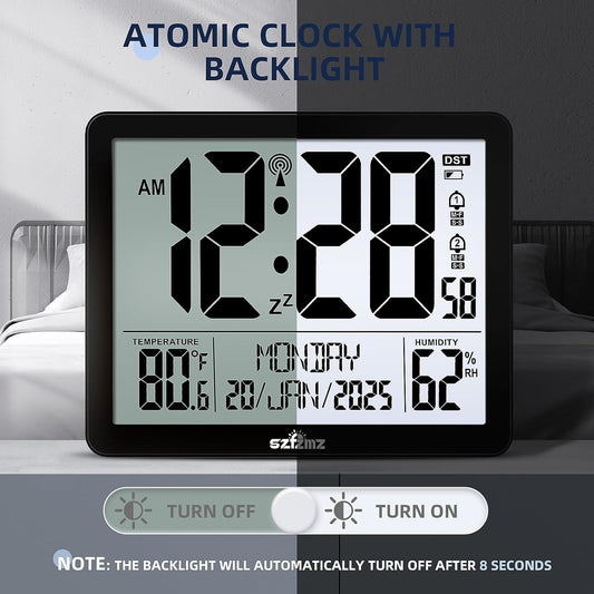 Atomic Digital Wall Clock Battery Operated with Backlight, Desk Clocks with Indoor Temperature & Humidity, 8.5" Small Alarm Clock with Date and Day of Week for Bedrooms, Living Room, Auto DST, Black